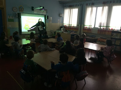 Nuestra auxiliar de conversación, Amanda, sigue triunfando entre nuestro alumnado y profesorado, gracias al excelente trabajo que viene realizando y a sus buenas dotes y recursos en la enseñanza del inglés y el trato con los escolares. Todos están más que contentos con ella y esperan siempre su presencia con agrado para participar en las actividades que les planifica. Aquí la podemos ver en una clase de 5 años, en la que todos la siguen con gran expectación.